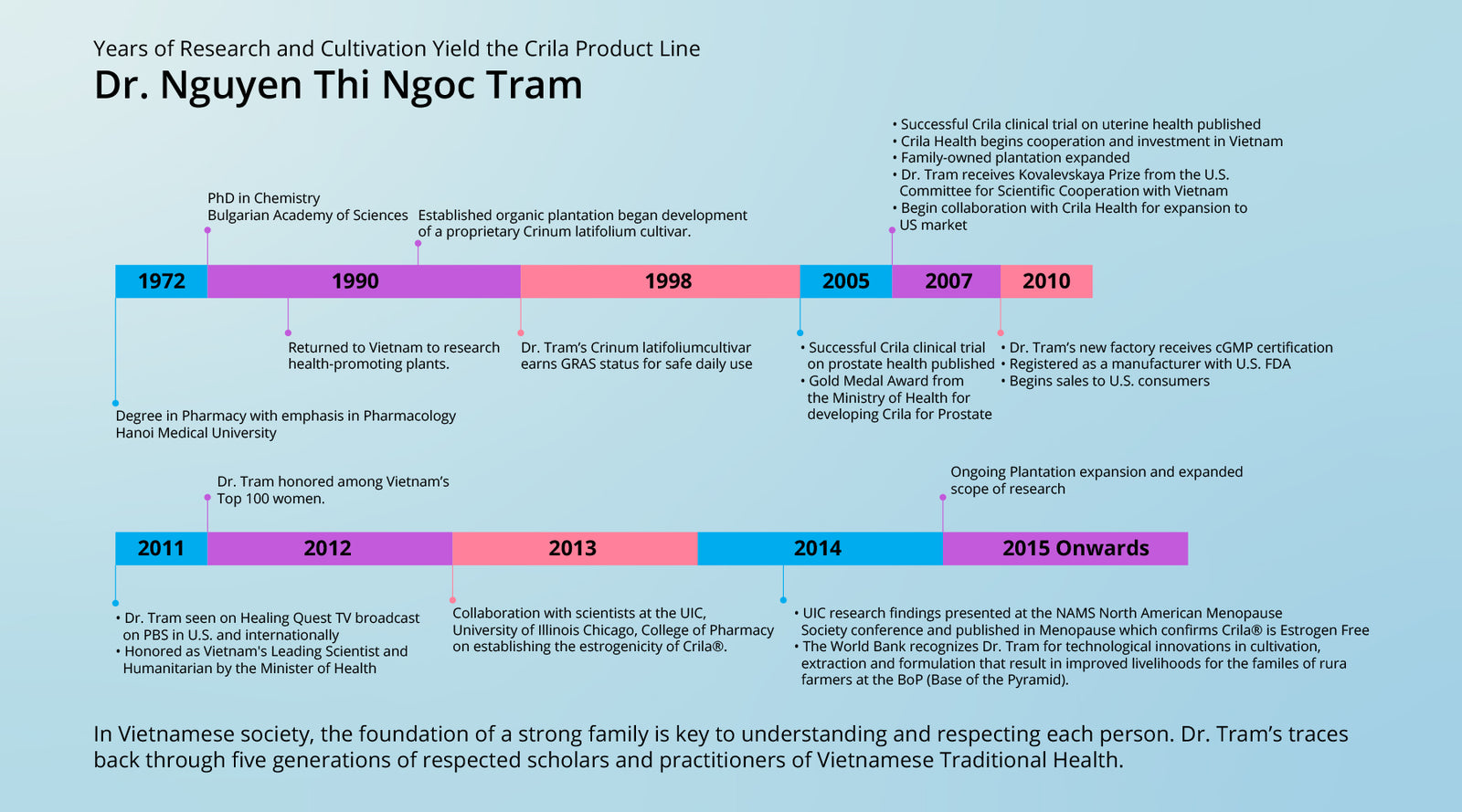 Since the 1980s, Dr. Tram has devoted her work to the evidence-based scientific study of the herbs used in Vietnamese Health Traditions